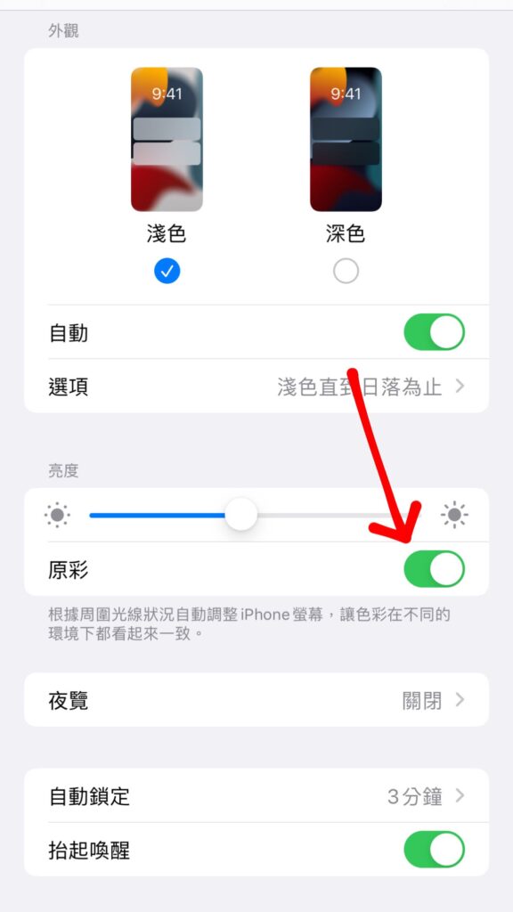 Step 2 將「原彩」開啟,即可根據周圍光線狀況自動調整iPhone螢幕