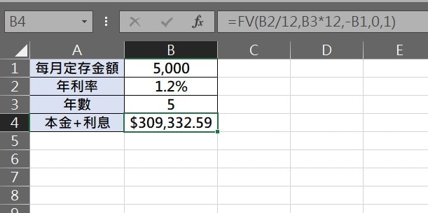 Step 2 使用FV函數,輸入公式「=FV(利率,總期數,定期支付的金額,期初餘額,支付的時間點)」,『定期支付的金額』須為負數,『期初餘額』未輸入則預設為0,『支付的時間點』輸入1則為期初支付,輸入0則為期末支付,以範例來說就是「=FV(年利率/12,年數*12,-定存每月金額,0,1)」