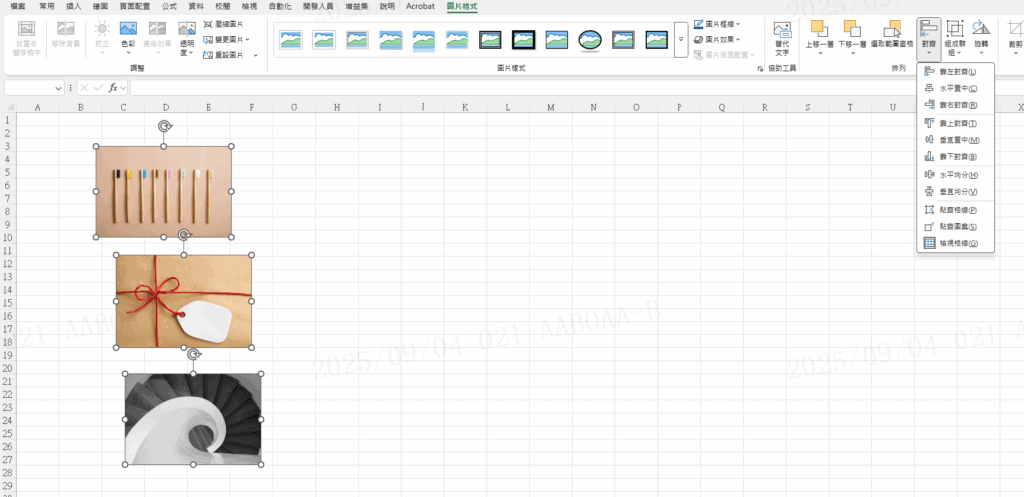 excel 圖片對齊Step 1 選取多張圖片(按住 Ctrl 鍵點選) Step 2 在功能列「圖片格式」中排列選擇「對齊」,再選擇你要的對齊方式即可 【教學】Excel 如何將圖片對齊?超簡單馬上學會!分享此文: 分享到 Facebook(在新視窗中開啟) Facebook 分享到 X(在新視窗中開啟) X