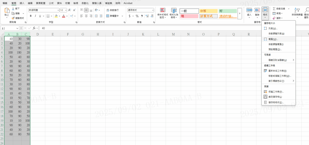 Step 1 選取你要平均分配的欄位(例如 A 到 C),在功能列常用中儲存格選擇「格式」內的「欄寬」