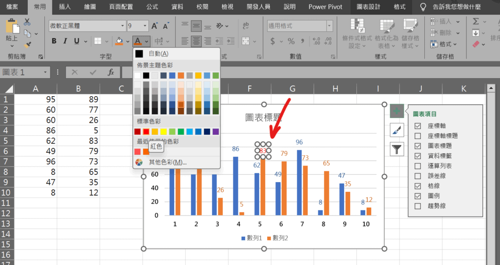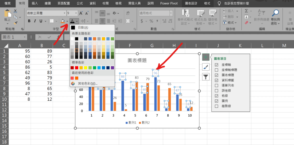 Step 2 點擊滑鼠「右鍵」選取數列數值,並在功能列「常用」中字型選擇「字型色彩」即可更改文字顏色