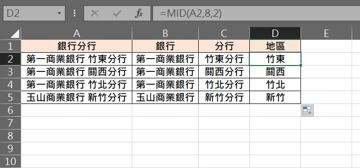 Step 3 使用MID函數,輸入公式「=MID(字串,開始字數,字數)」,指定開始字數位置,並設定擷取字數,以範例來說就是「=MID(銀行分行,8,2)」,由字串第8開始,空白也算一個字串,並擷取2個字串