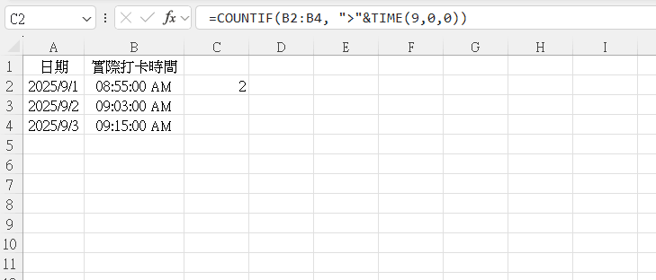 ◆ 「>」 代表「大於」。這個公式會去統計 B 欄中,有多少個打卡時間晚於 9:00。