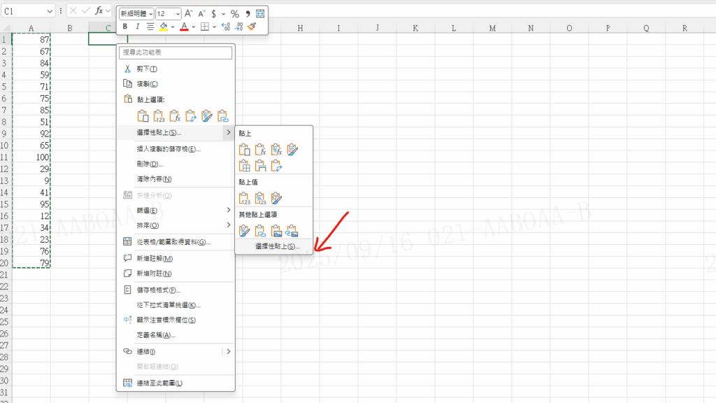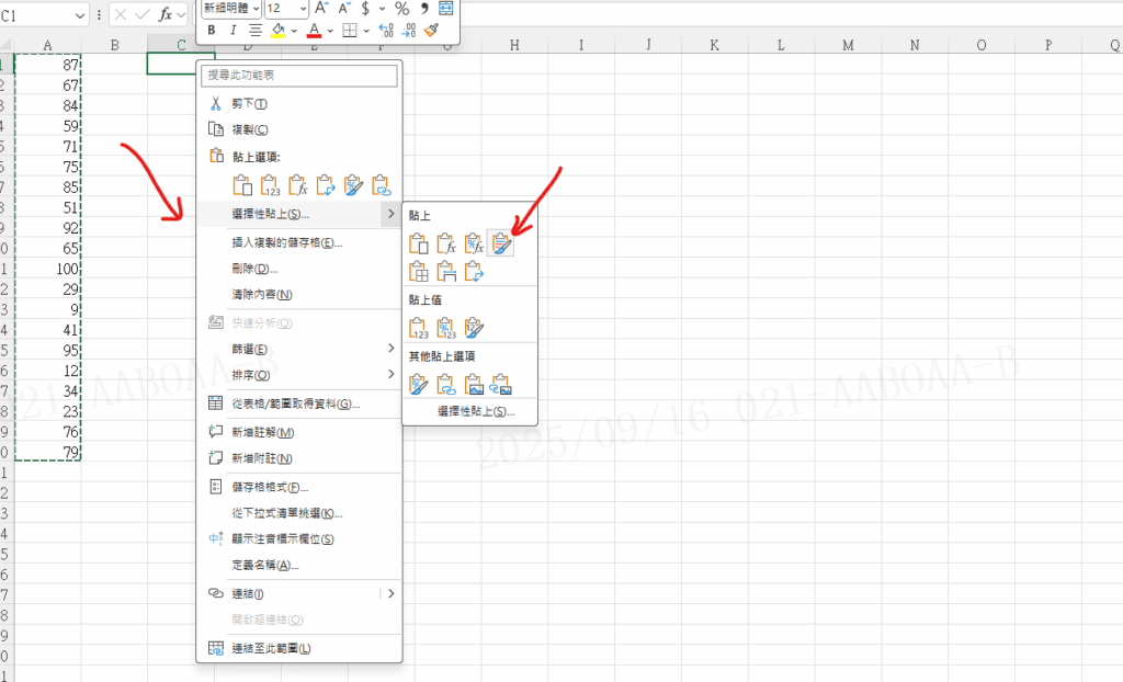 Step 1 複製你的原始資料(Ctrl + C),在目標儲存格上右鍵點擊,然後選擇「選擇性貼上」(或者,你可以使用快捷鍵 Ctrl + Alt + V)
