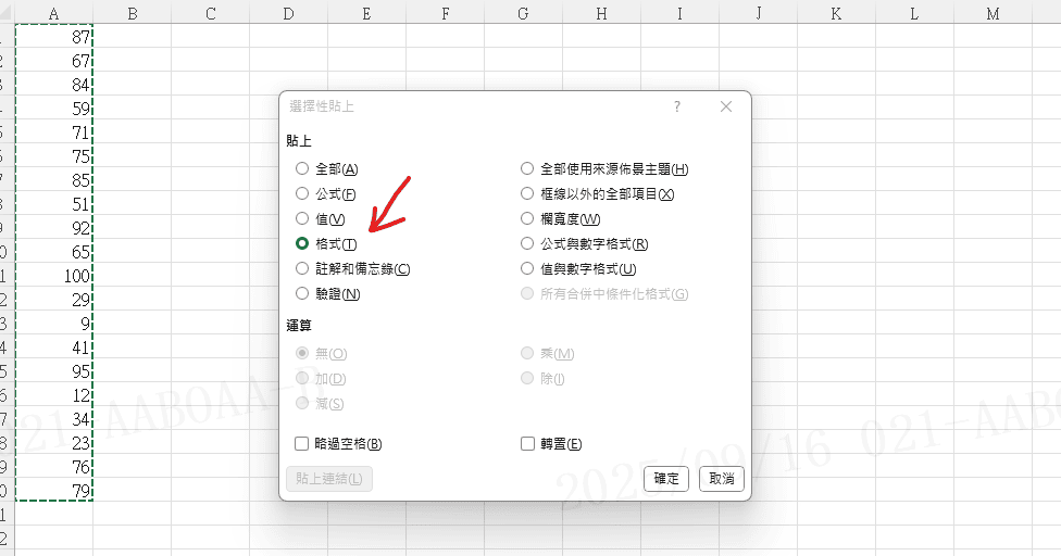 Step 2 在彈出的視窗中,選擇「格式」選項,然後點擊「確定」,這個方法只會貼上原始資料的格式(例如:字型、顏色、邊框、數字格式等),而不會貼上數值或公式。如果你想只貼上格式,這是一個非常實用的方法