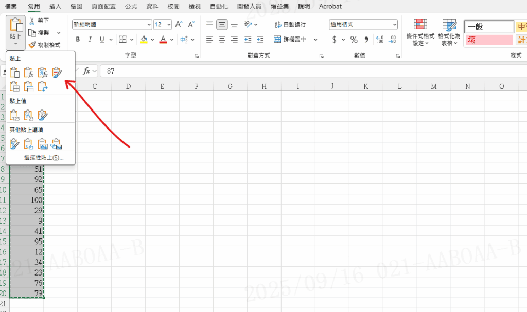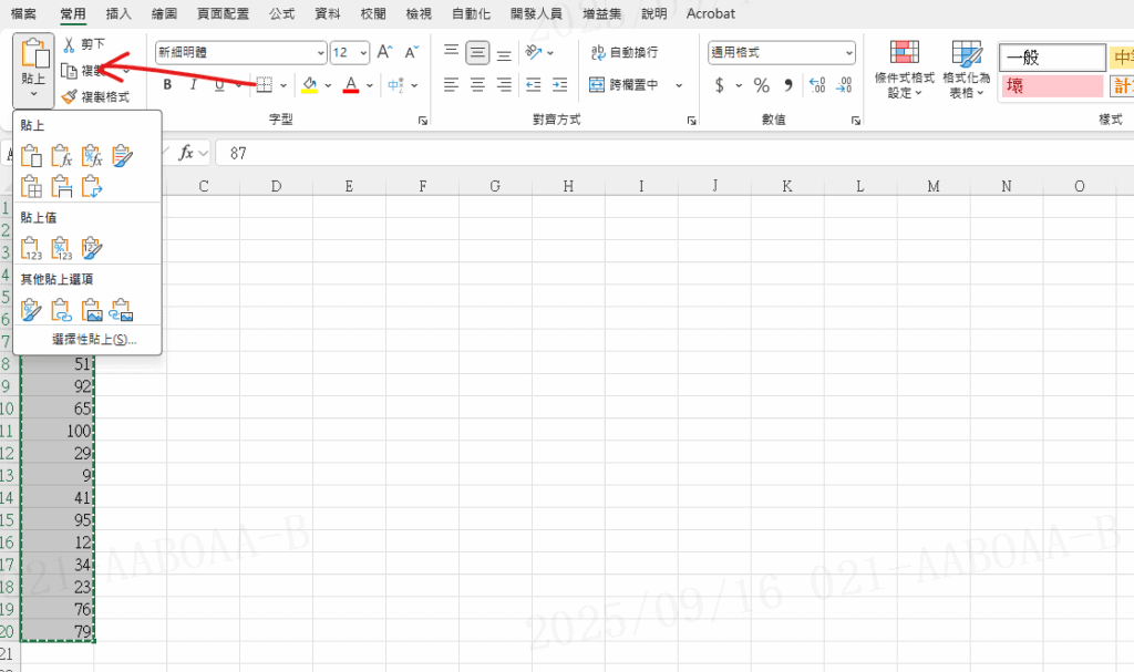Step 1 複製你的原始資料(Ctrl + C),選擇目標儲存格,在功能區的 「常用」 選項找到 「貼上」 按鈕