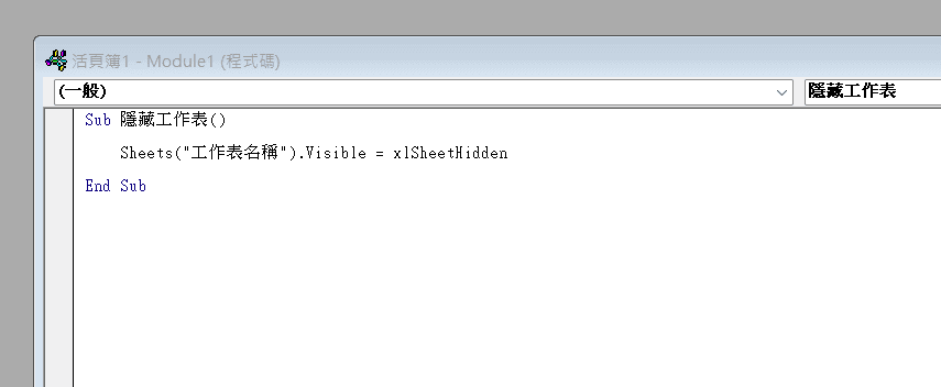 將下方程式碼貼上自己的巨集中,將”工作表名稱”修改為要隱藏的工作表名稱即可