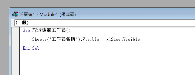 將下方程式碼貼上自己的巨集中,將”工作表名稱”修改為要取消隱藏的工作表名稱即可