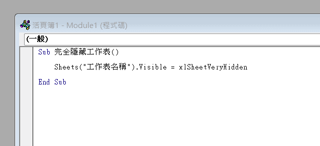將下方程式碼貼上自己的巨集中,將”工作表名稱”修改為要完全隱藏的工作表名稱即可