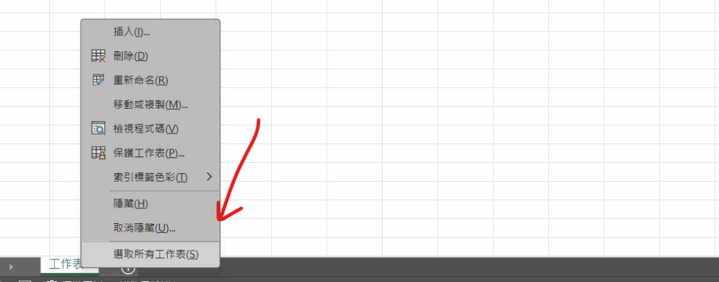 被隱藏的工作表可以在下方工左表列表中點選滑鼠「右鍵」,選擇「取消隱藏」後重新顯示