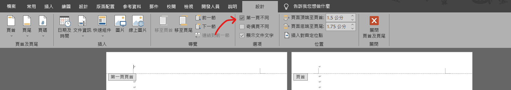 Step 4 上方功能列會出現「設計」,將「第一頁不同」打勾