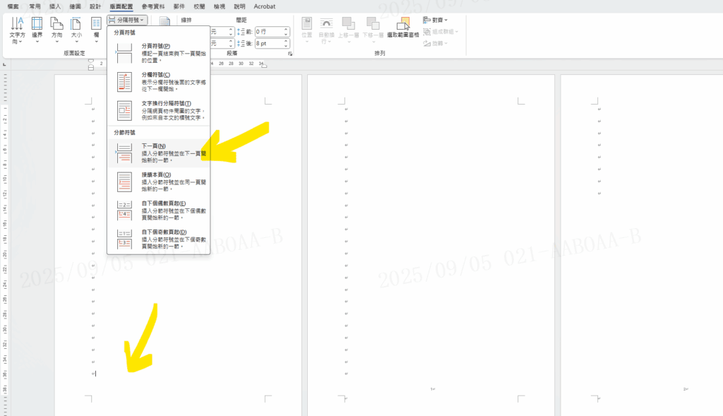 Step 1 在第一頁最後位置,在功能列「版面配置」中版面設定選擇「分隔符號」內的「下一頁」