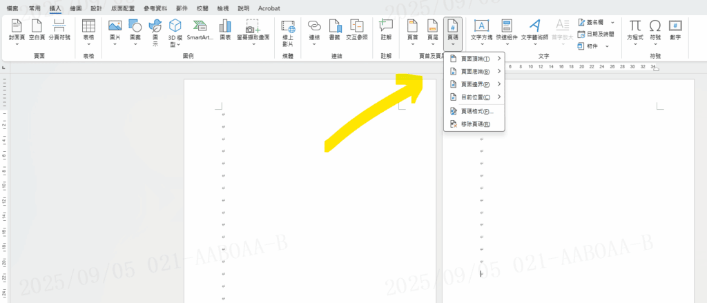 Step 2 在第二頁點選功能區上的 插入 → 頁碼 → 選擇你要的頁碼位置(例如頁尾)