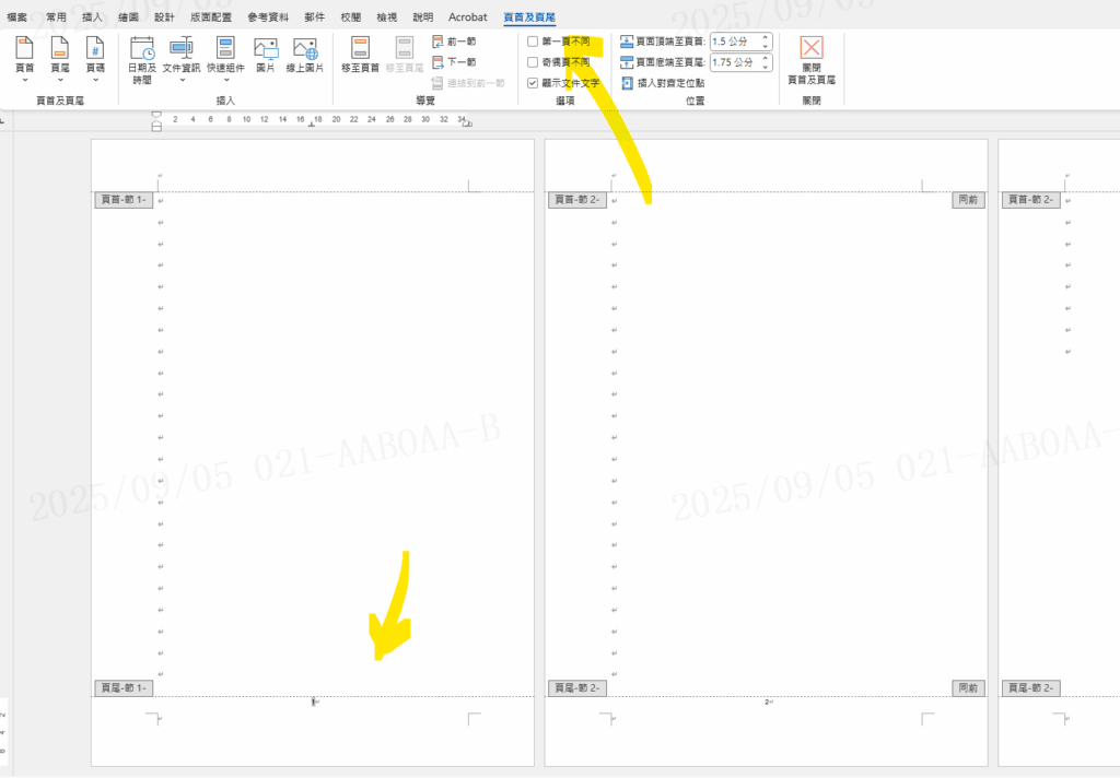 Step 3 選取第一頁頁碼,在功能列「頁首及頁尾」中選項將「第一頁不同」勾選