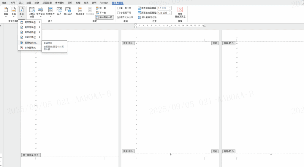 Step 4 在功能列「頁首及頁尾」中選擇「頁碼」內的「頁碼格式」