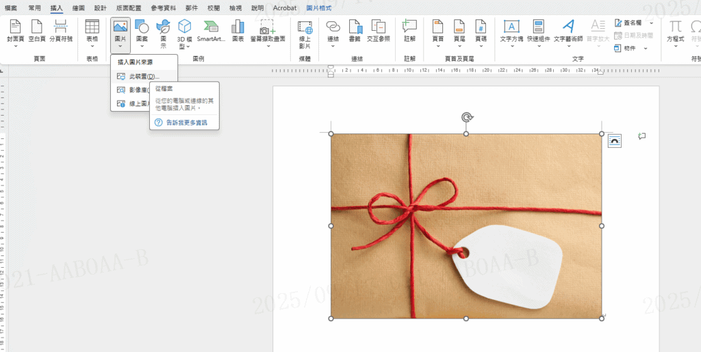 Step 1 在 Word 文件中,點擊上方的 「插入」 標籤,點擊 「圖片」,然後選擇你想要使用的圖片,將其插入到文件中