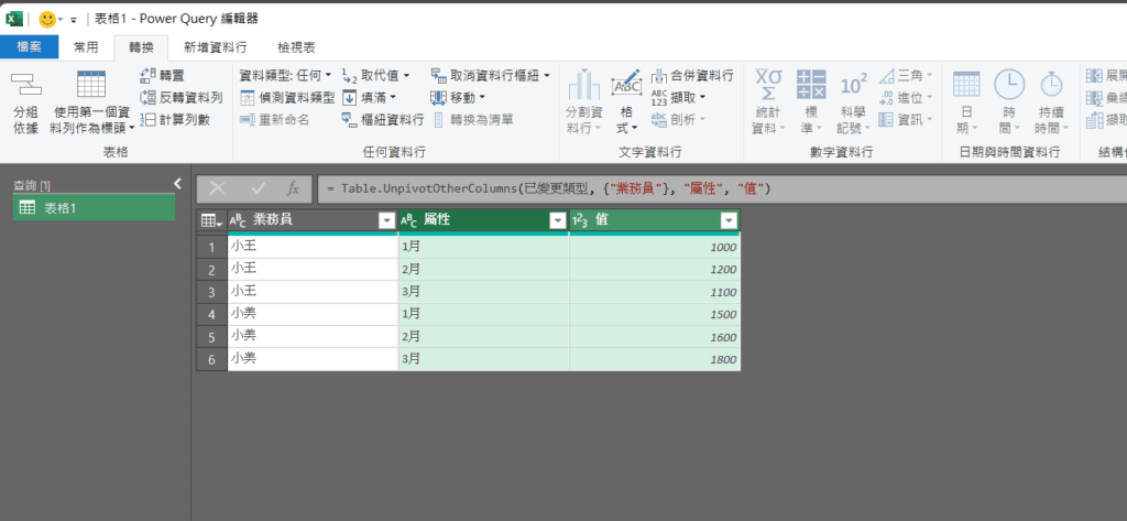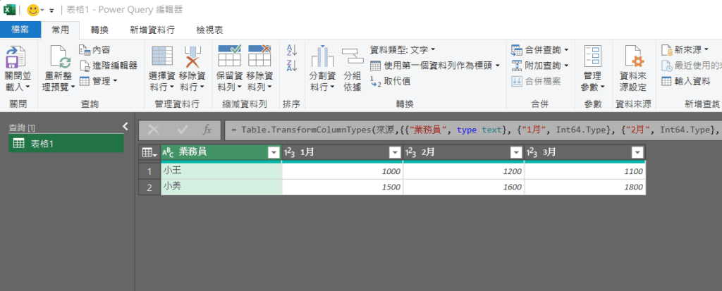 Step 3 進入 Power Query 畫面後,請先觀察你的資料。 哪一欄是永遠不會變動的基準點?在這個例子中,是 [業務員]。 (因為後面的 1月、2月… 以後可能會增加 4月、5月,它們是變動的)。用滑鼠點選 [業務員] 這一欄(讓它變綠色被選取)