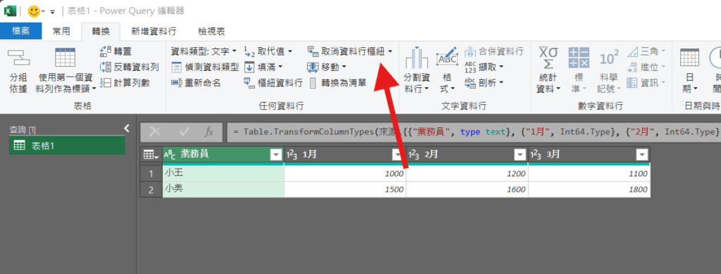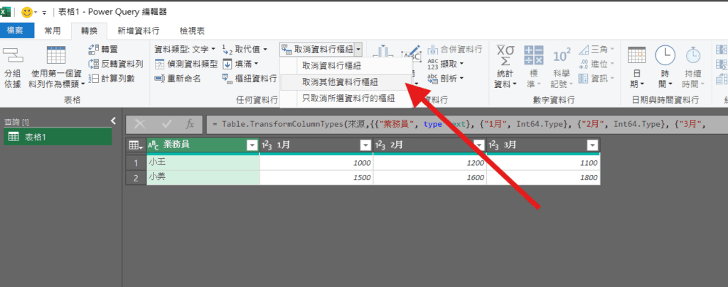 Step 4 在上方標籤選 「轉換」 (Transform),點擊 「取消樞紐資料行」 (Unpivot Columns) 旁邊的小箭頭