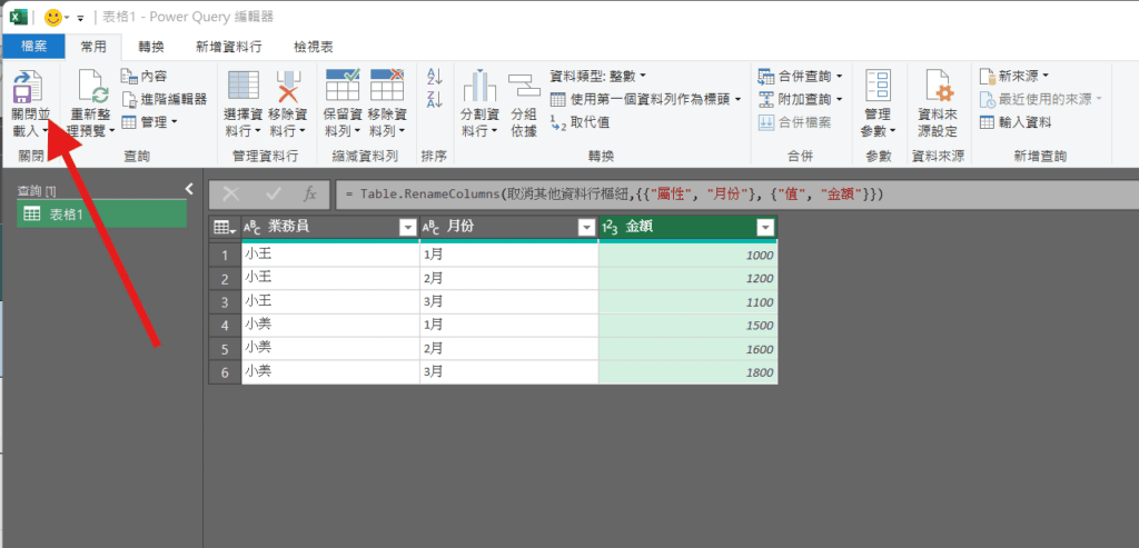 Step 7 記得把標題「屬性」改名為「月份」,「值」改名為「金額」。 最後按左上角的 「關閉並載入」,Excel 就會吐出一張全新的綠色表格給你