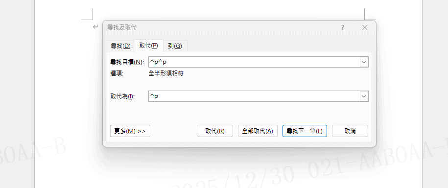 尋找內容: 輸入 ^p^p(代表連續兩個 Enter),取代為: 輸入 ^p(代表只留一個 Enter),連續點擊 「全部取代」,直到系統顯示取代次數為 0。