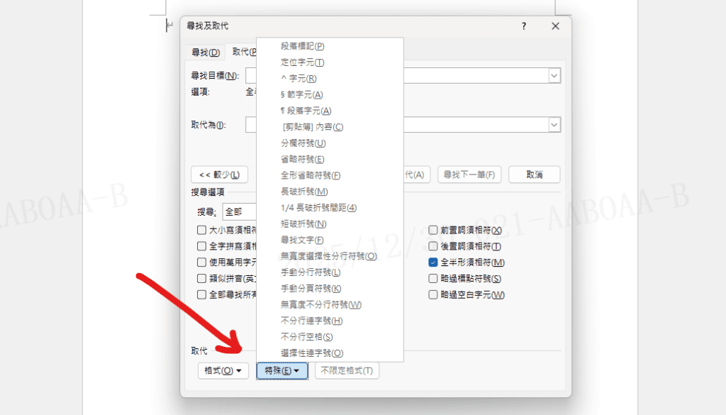 Step 2 點擊下方的 「特殊 (Special)」,你就會看到「段落標記」、「手動換行符號」、「全形空格」等完整清單,直接點選即可自動輸入代碼