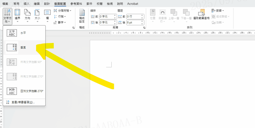 Step 1 在功能列「版面配置」中版面設定選擇「文字方向」,並選擇「垂直」