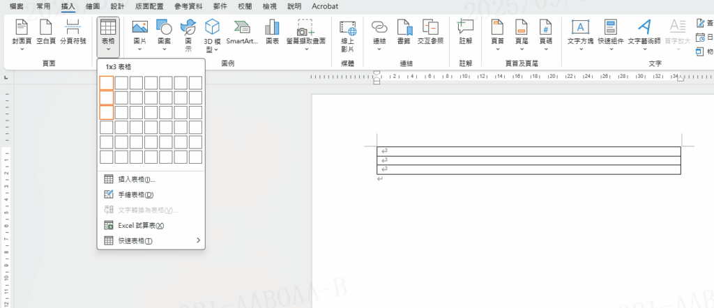 Step 1 在功能列「插入」中表格選擇「表格」並插入