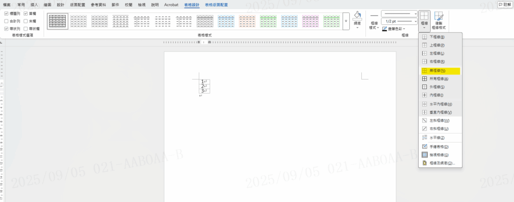 Step 2 輸入數字後,將表格全選,在功能列「表格設計」中框線選擇「無框線」即可